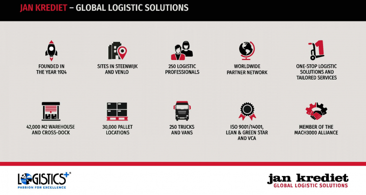 Jan Krediet (JK) is a leading European logistics service provider in the furniture, kitchens, project furnishing, forwarding, warehousing, and value-added services segments with offices and warehouses in Steenwijk, NL, where its headquarters are located and in Venlo. JK was founded in 1924 and has over 200 logistics professionals, 250 trucks and vans, and over 60 thousand square meters of warehousing space. JK is part of the global furniture logistics network Mach 3000 and has experienced strong growth in recent years, with 40 million euros in sales. The company was recently recognized as the best Transport and Logistics Netherlands (TLN) company and a Top 100 Logistics Service Provider in the Netherlands.