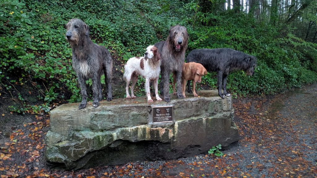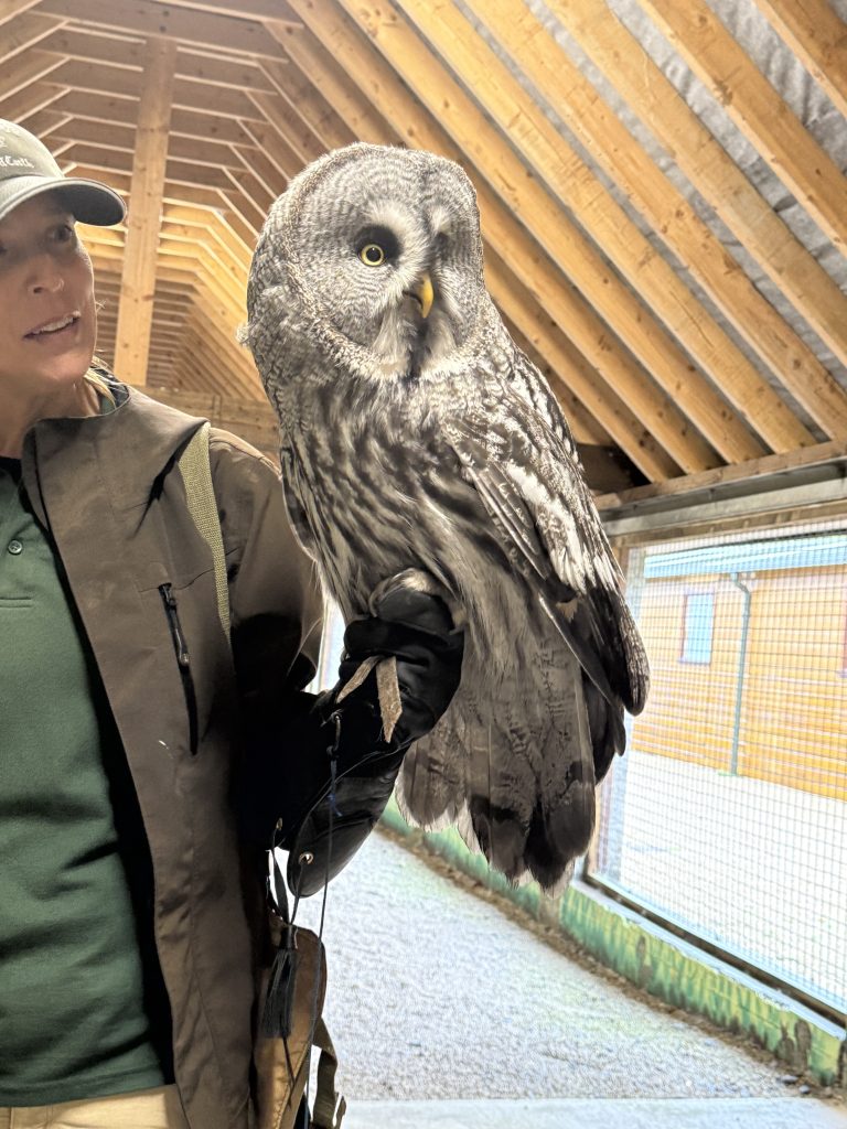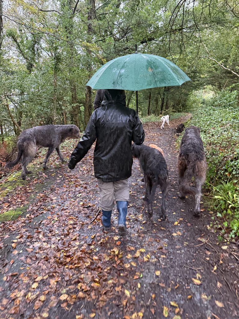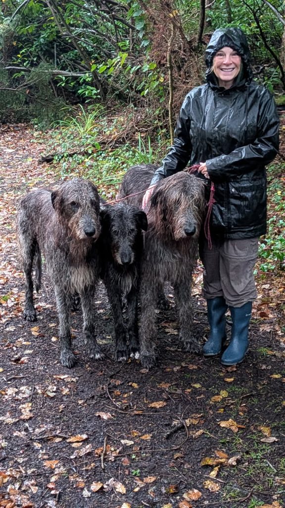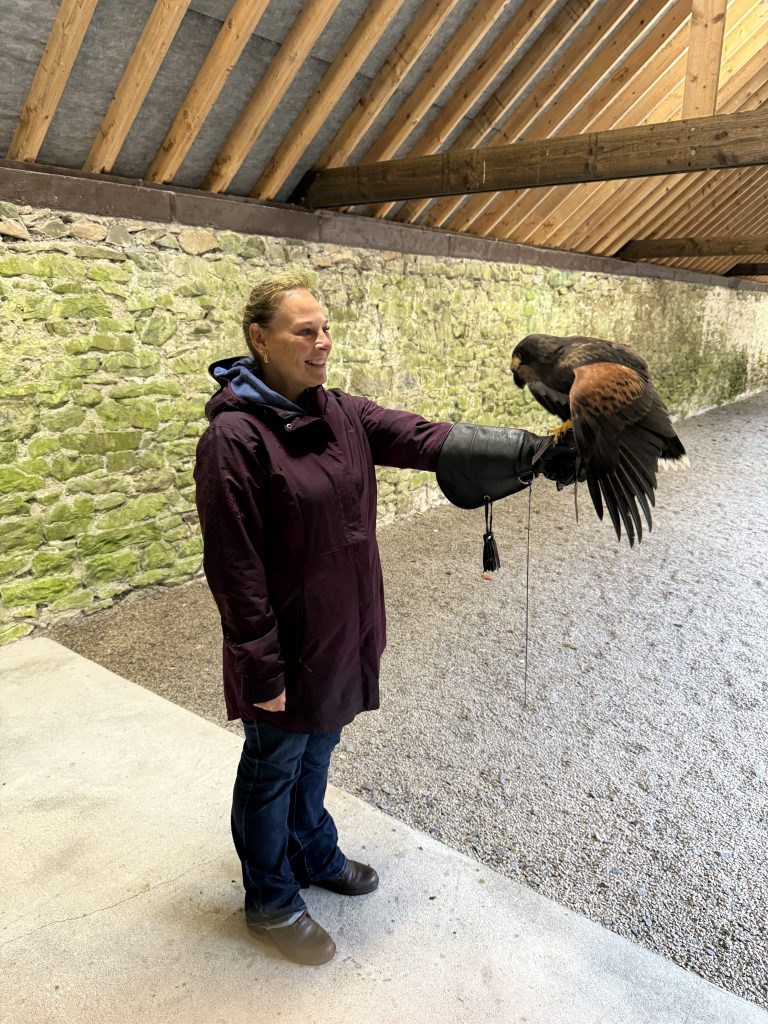 The hawks, falcons, and owls were magnificent, as were their dogs.  Irish Wolfhounds were trained to hunt wolves — thus their name. And while ferocious hunters, they were tame and gentle with us. The funniest thing is when we showed up at 8 am for the walk in the pouring rain, the man in charge looked us all over, standing there dripping in the rain, and slowly said, “I HATE YOU ALL” 🤣